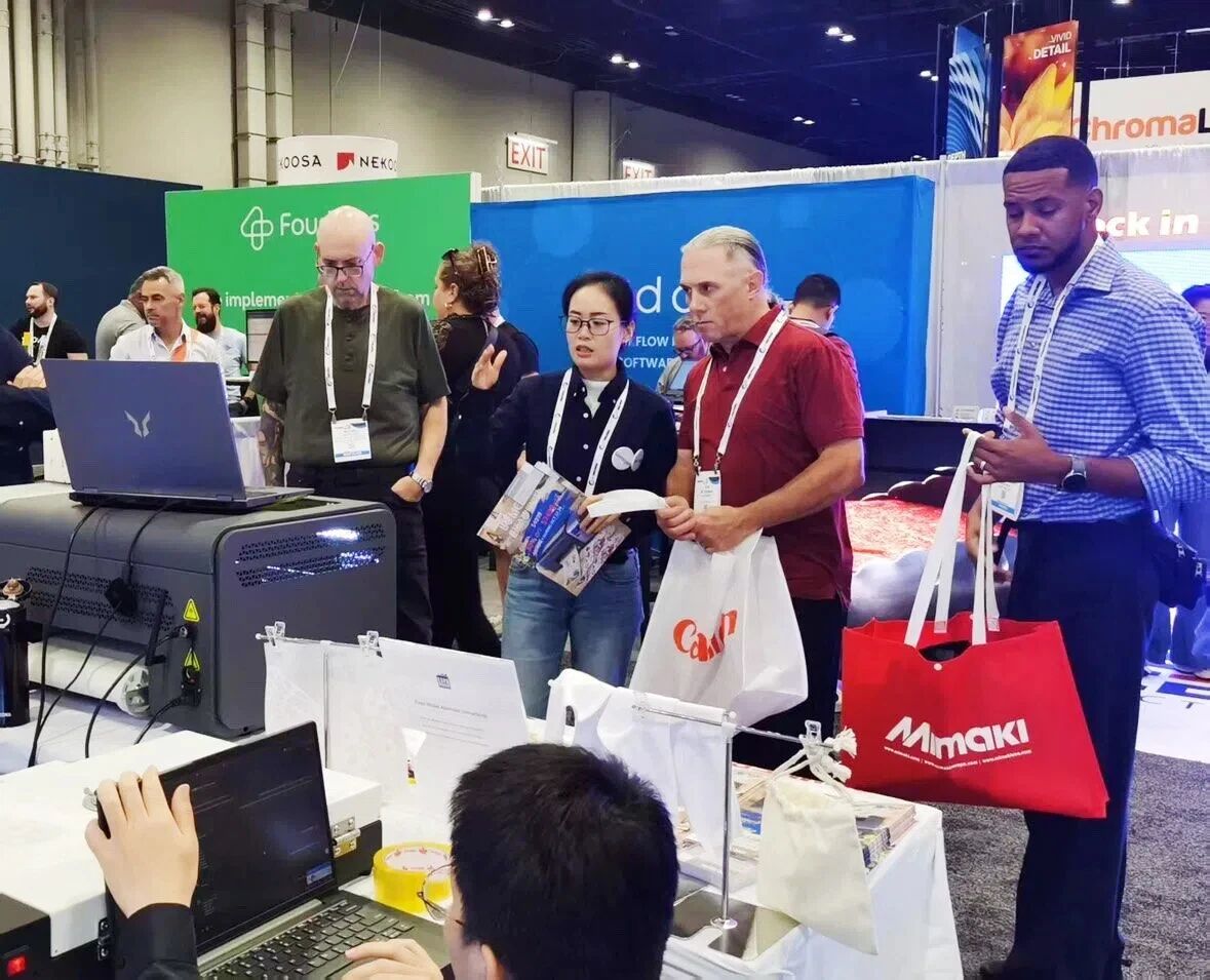 We set up a product experience zone at our booth, displaying a variety of DTF-printed samples such as T-shirts, canvas bags, and caps. The vibrant colors and fine details attracted crowds of visitors to touch, explore, and discuss printing techniques and applications with our technical team on site.